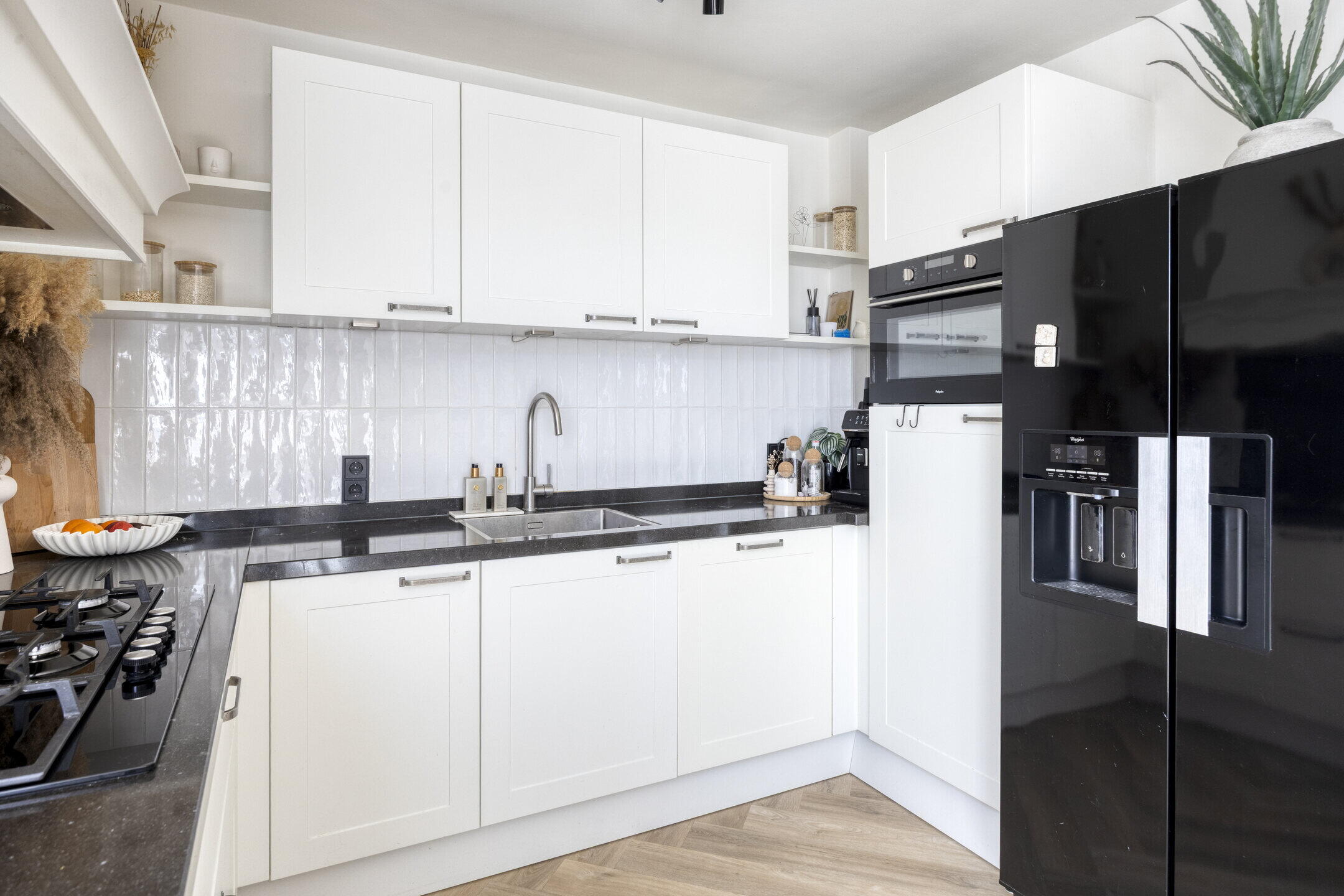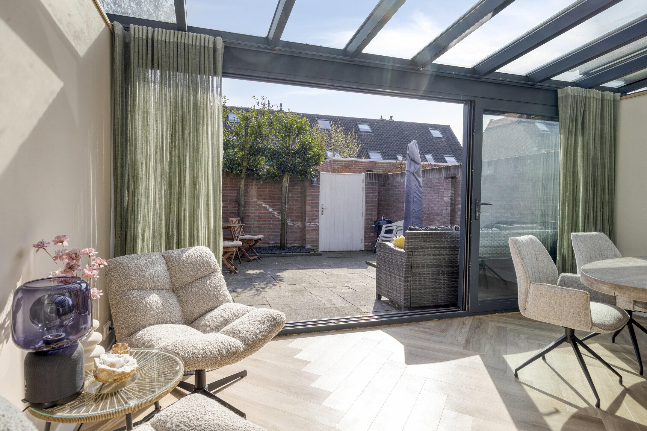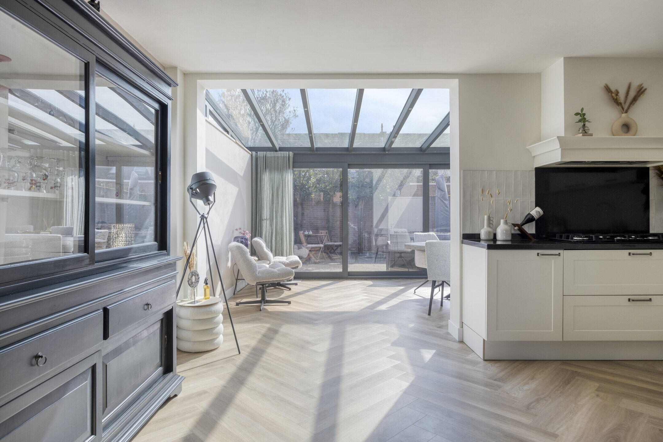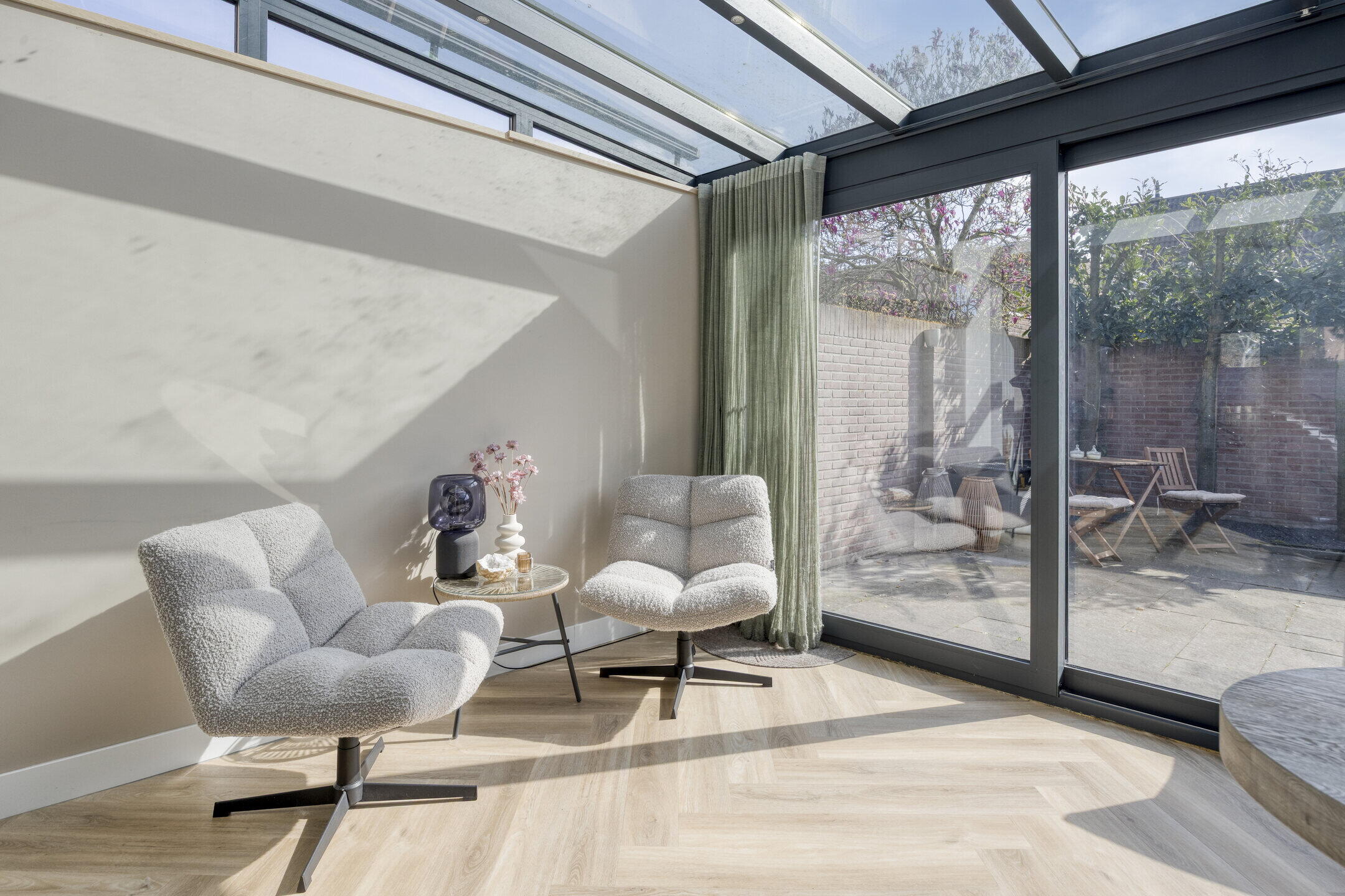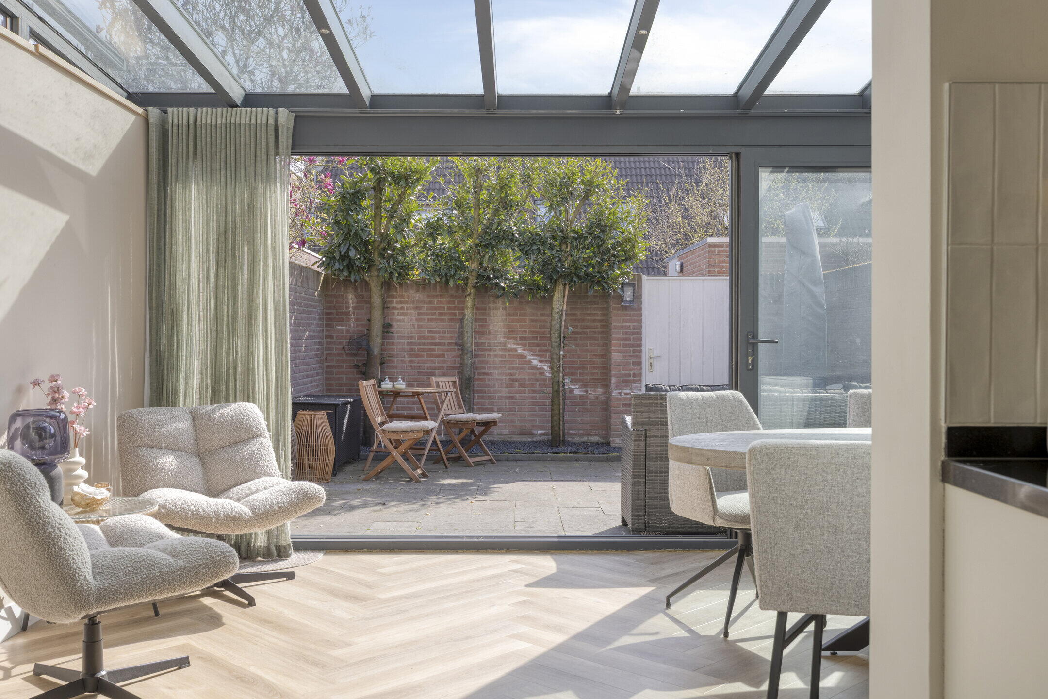 Aan de voorzijde van de woning bevindt zich het zitgedeelte, waar je moeiteloos een royale hoekbank of U-bank plaatst, een fijne plek om te ontspannen. Richting de achterzijde kom je bij de keuken, opgesteld in een praktische U-vorm. De keuken is uitgevoerd met witte fronten, een donker werkblad en een lichtgrijze metro tegel als achterwand. Uiteraard voorzien van alle gemakken zoals een fornuis, afzuigkap, combi-oven, vaatwasser en een koelkast. Aansluitend loop je door naar de serre, een echte eyecatcher! Deze ruimte vormt een prachtig verlengstuk van de woonkamer, met dezelfde vloer voor een mooi geheel. Dankzij het dak en de grote schuifpui geniet je hier van een geweldige lichtinval. Er is volop ruimte voor een eettafel voor 6 personen én een extra zitje, perfect om even tot rust te komen met een boek. In de zomer zet je de schuifpui open en ontstaat er een heerlijk binnen-buiten gevoel.