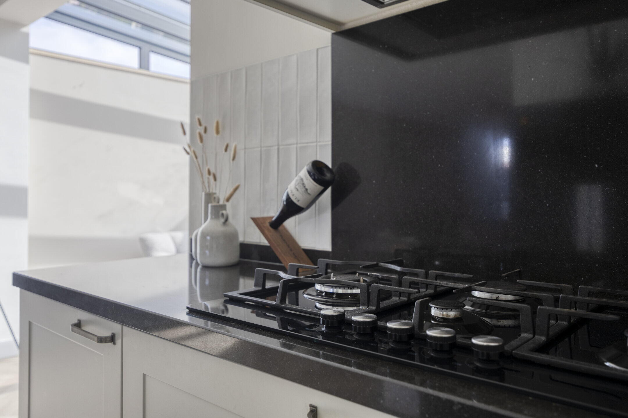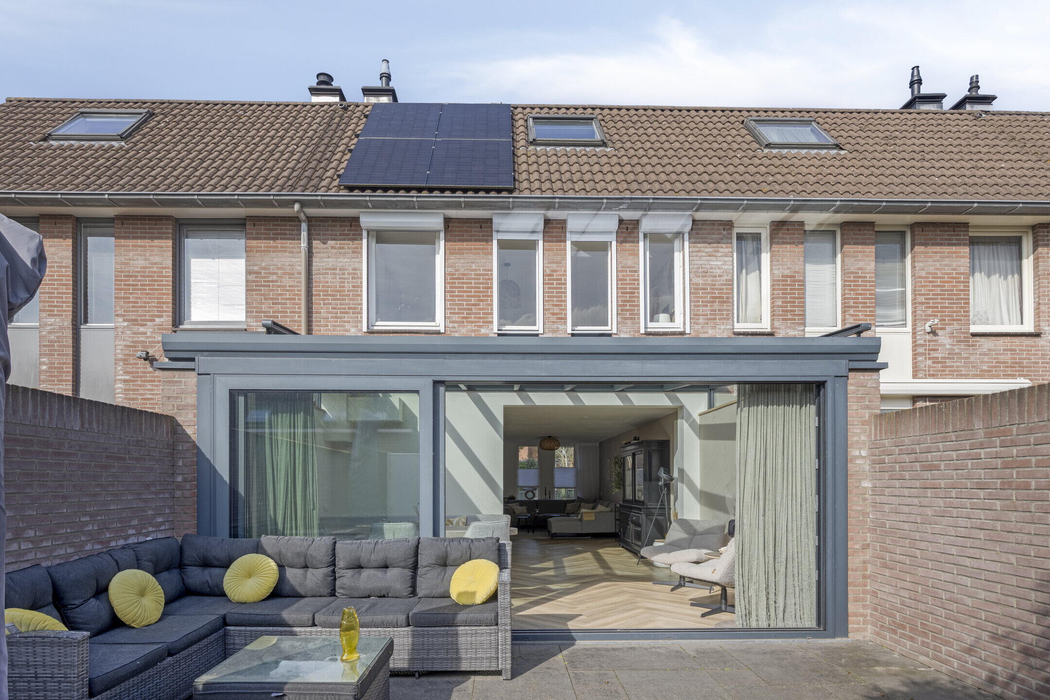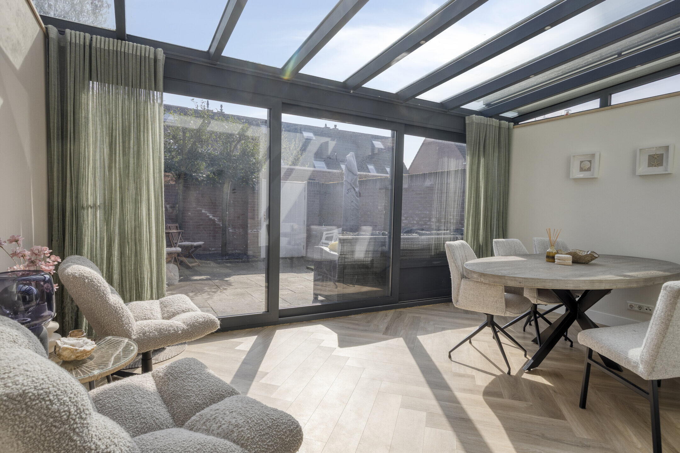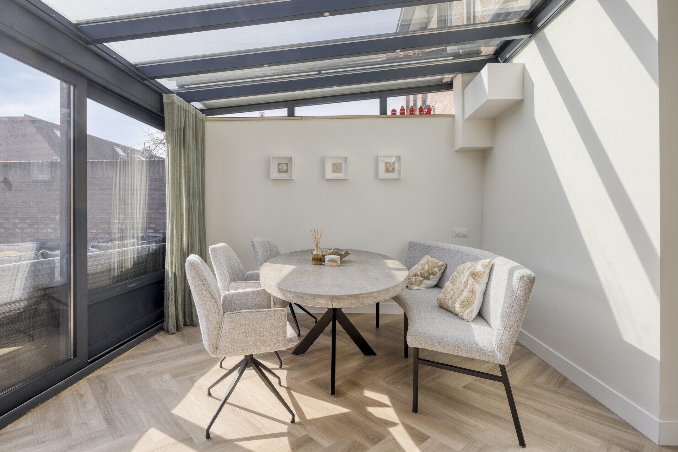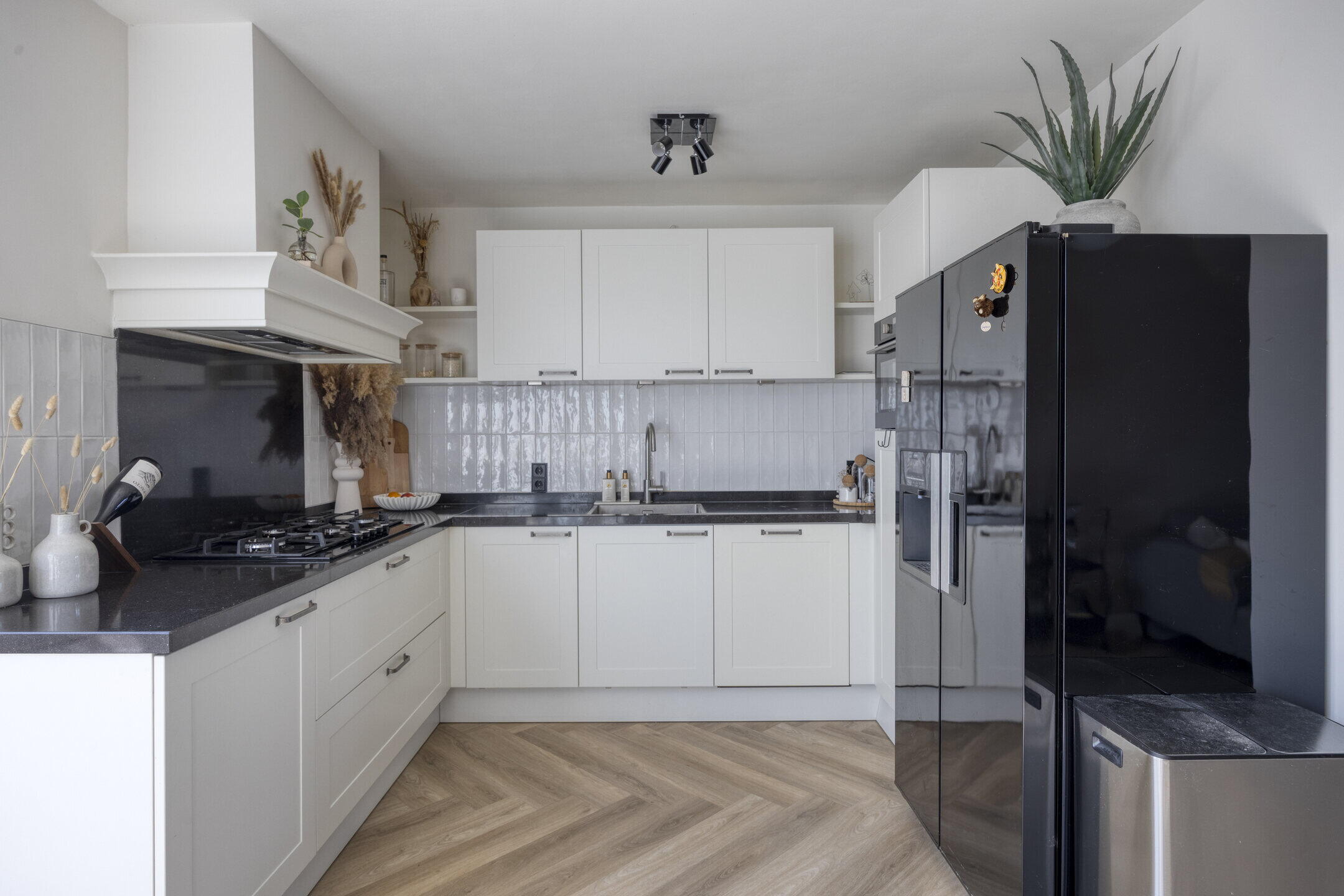 Aan de voorzijde van de woning bevindt zich het zitgedeelte, waar je moeiteloos een royale hoekbank of U-bank plaatst, een fijne plek om te ontspannen. Richting de achterzijde kom je bij de keuken, opgesteld in een praktische U-vorm. De keuken is uitgevoerd met witte fronten, een donker werkblad en een lichtgrijze metro tegel als achterwand. Uiteraard voorzien van alle gemakken zoals een fornuis, afzuigkap, combi-oven, vaatwasser en een koelkast. Aansluitend loop je door naar de serre, een echte eyecatcher! Deze ruimte vormt een prachtig verlengstuk van de woonkamer, met dezelfde vloer voor een mooi geheel. Dankzij het dak en de grote schuifpui geniet je hier van een geweldige lichtinval. Er is volop ruimte voor een eettafel voor 6 personen én een extra zitje, perfect om even tot rust te komen met een boek. In de zomer zet je de schuifpui open en ontstaat er een heerlijk binnen-buiten gevoel.