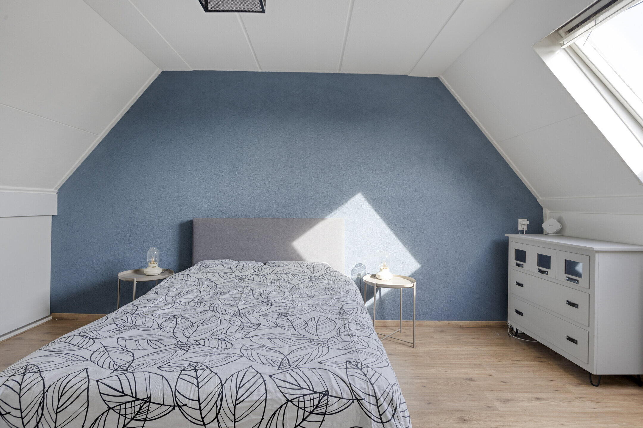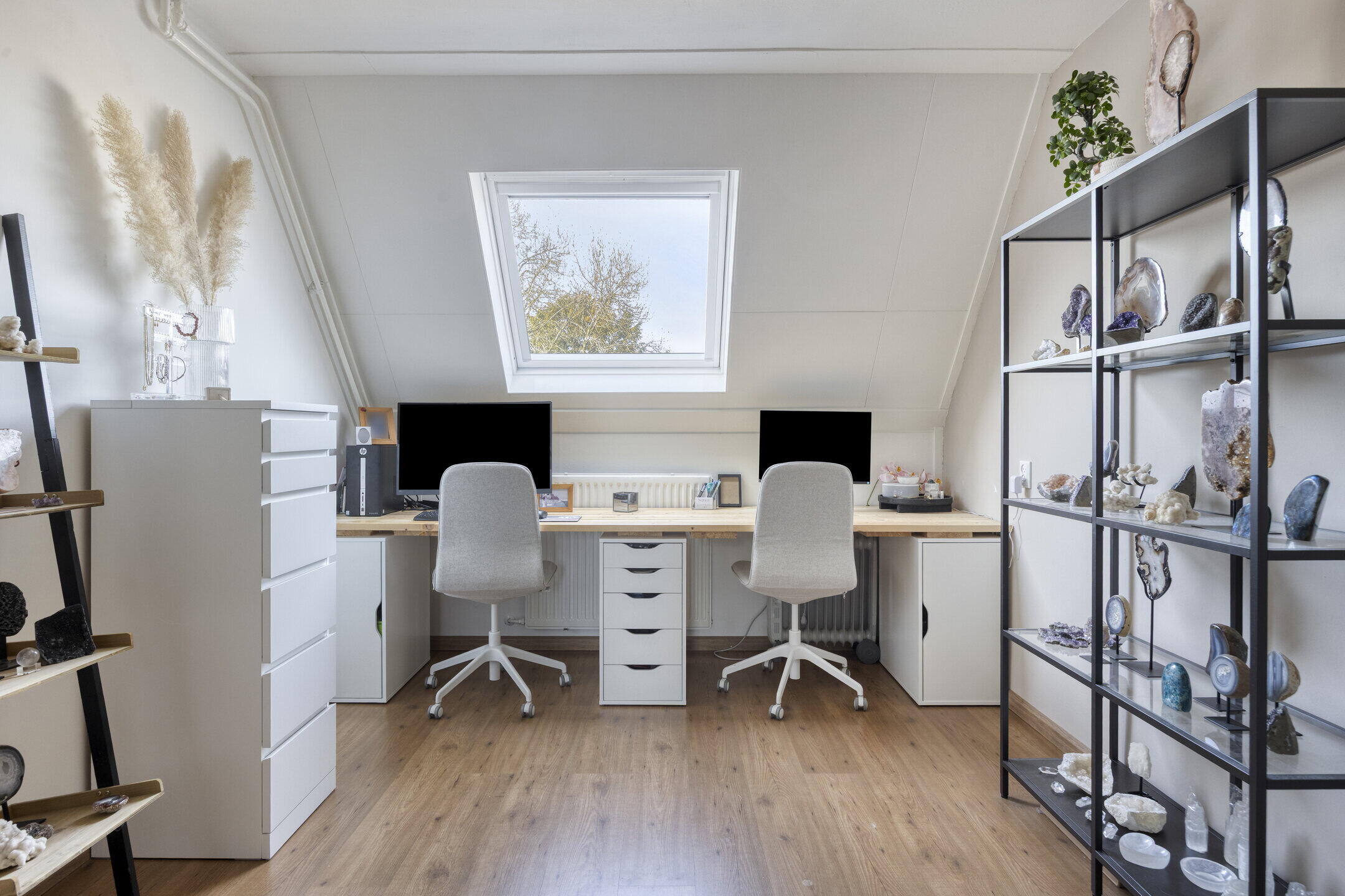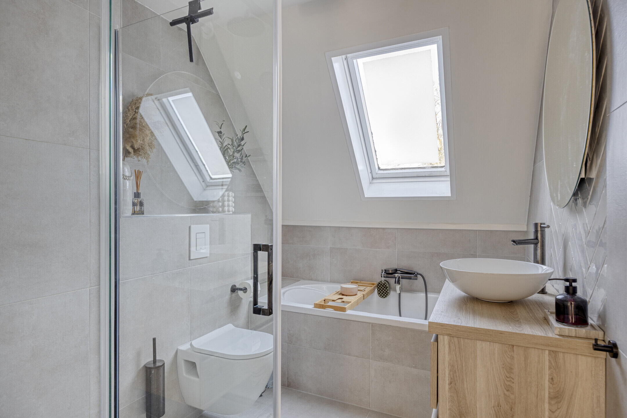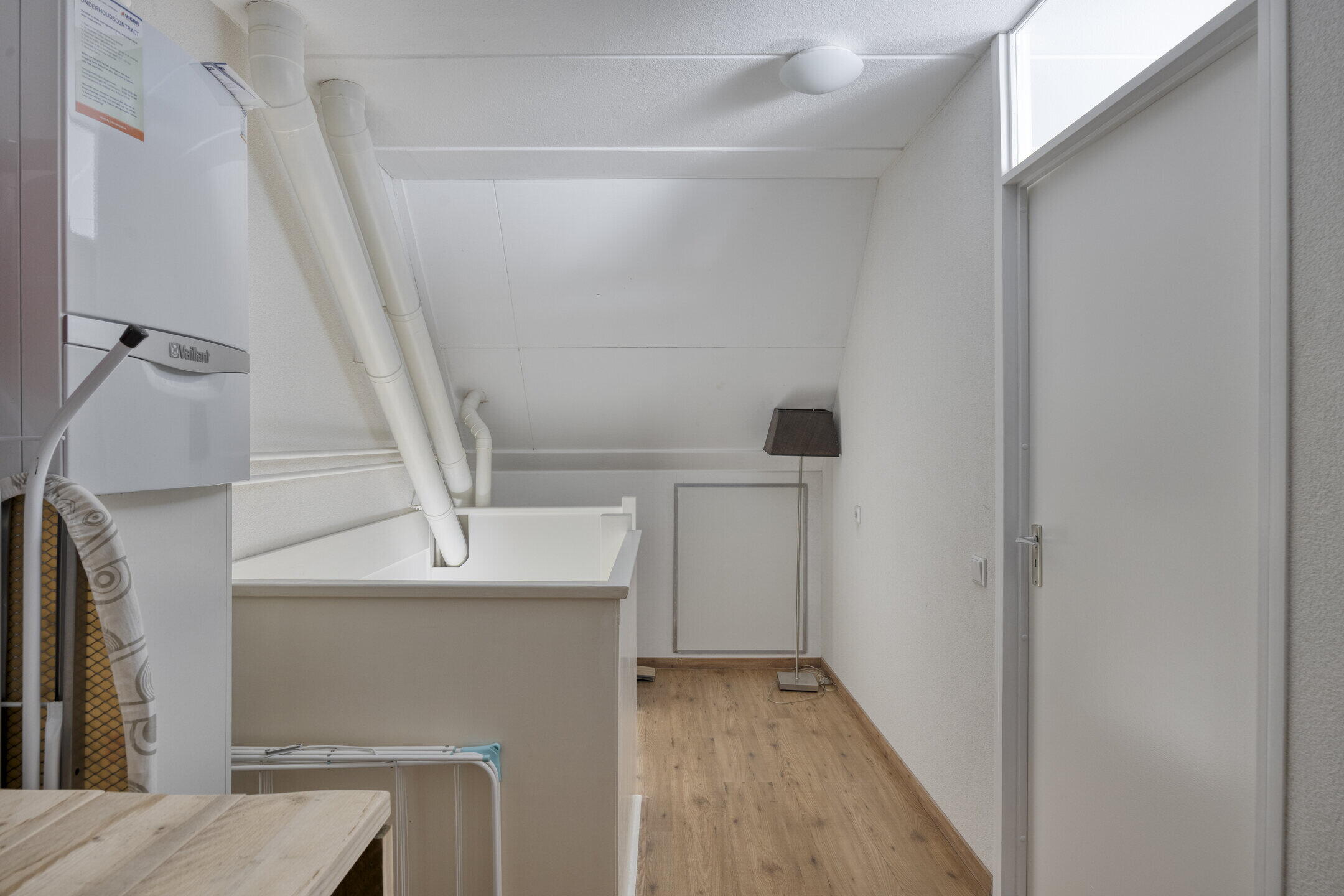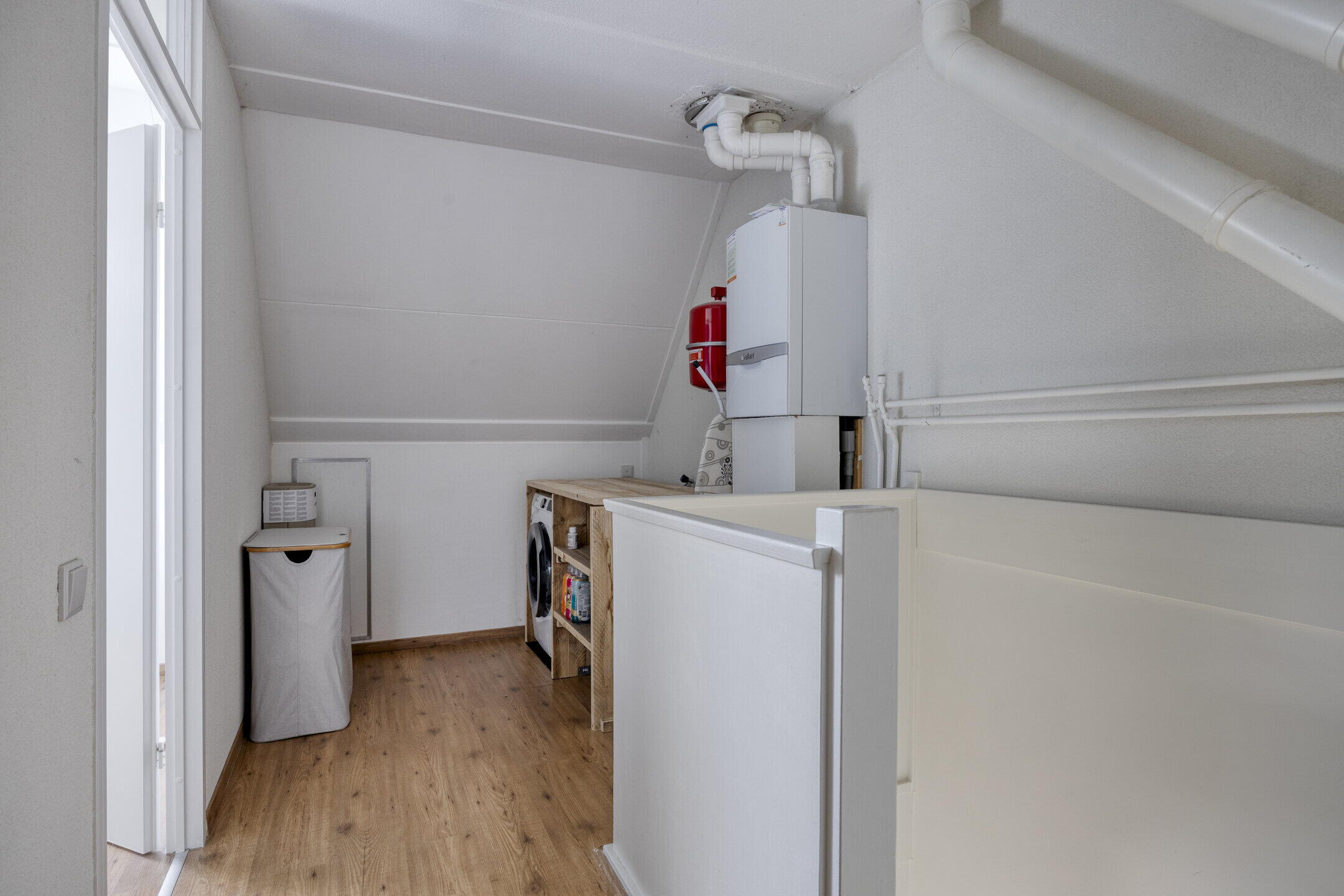 De tweede verdieping beschikt over een praktische overloop met aansluitingen voor wasmachine en de cv-ketel, evenals bergruimte achter de knieschotten. Hier vind je ook de derde slaapkamer: een ruime kamer met dakraam en volop opbergruimte.