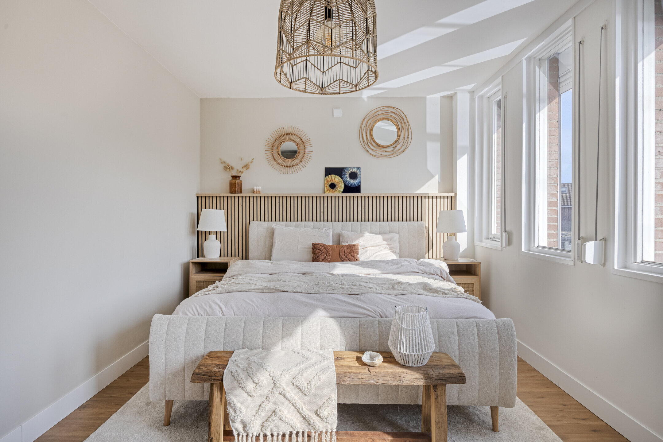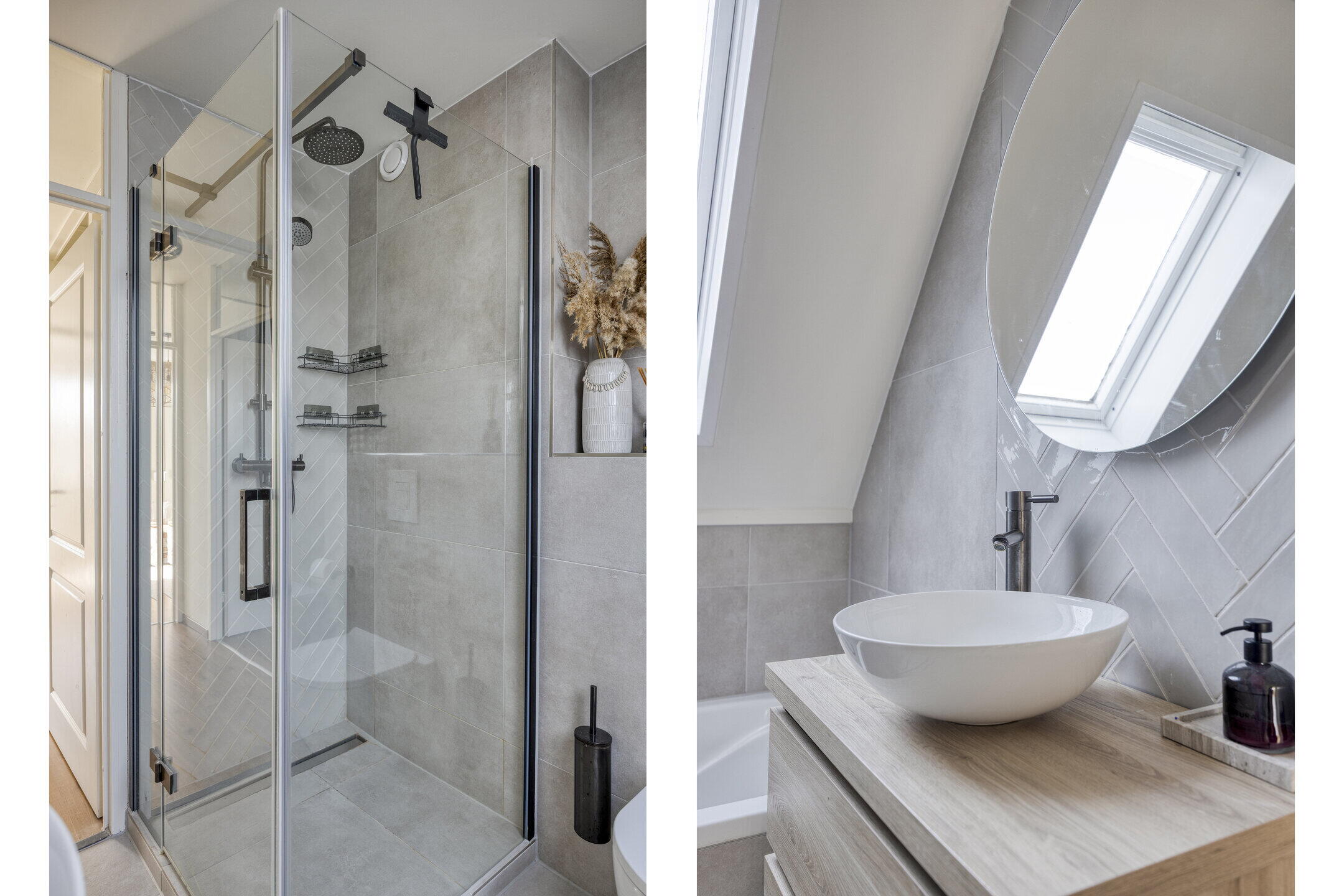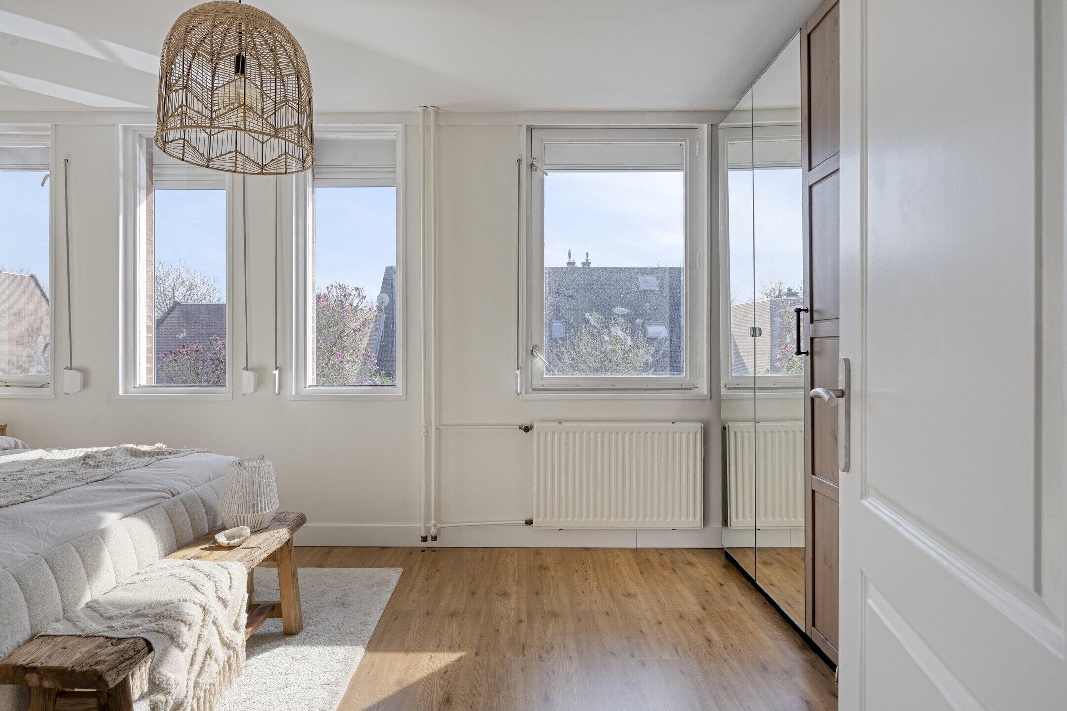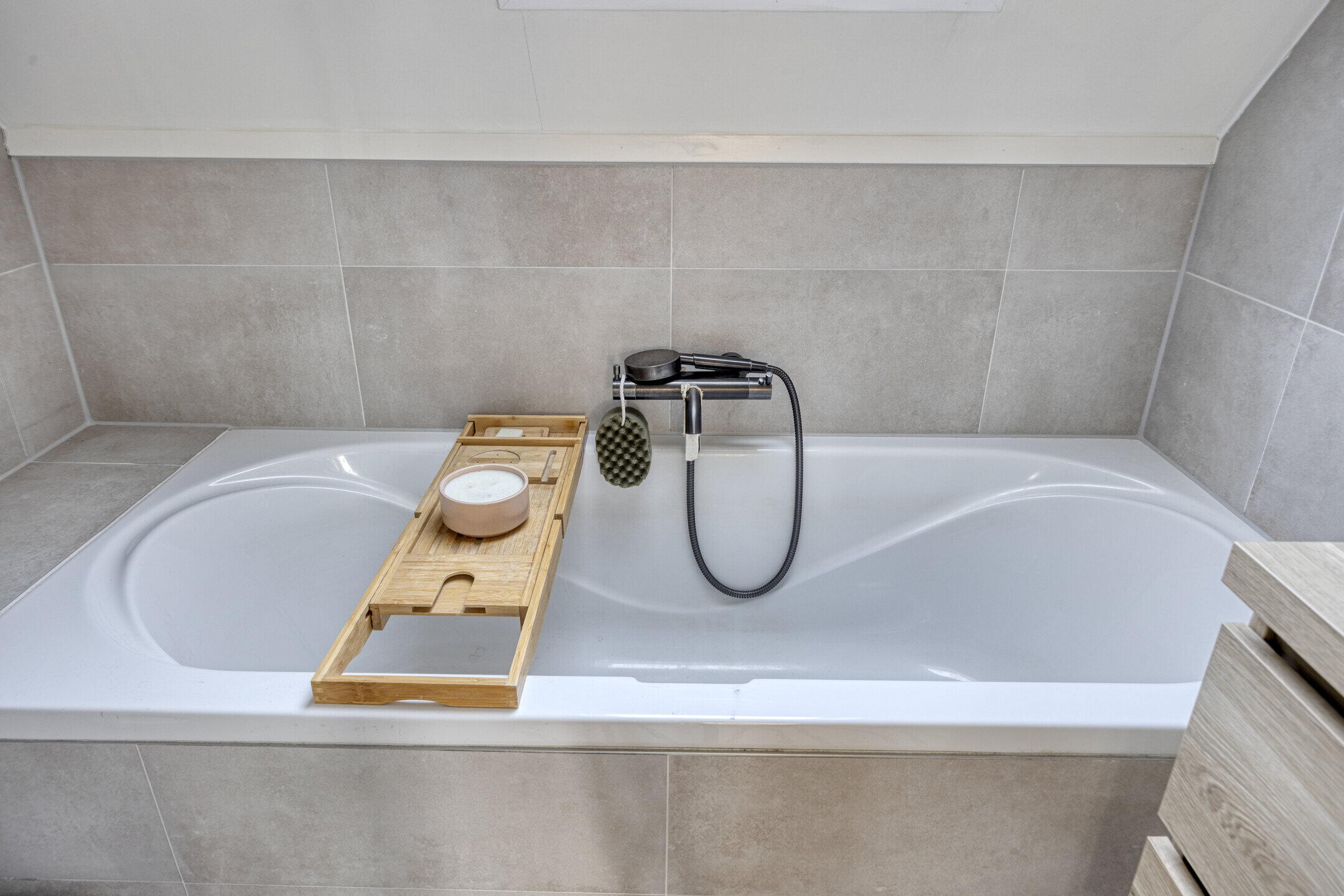 Op de eerste verdieping bevinden zich twee ruime slaapkamers. De master bedroom aan de achterzijde beslaat de volledige breedte van de woning en biedt ruimte voor een tweepersoonsbed en een grote kledingkast. De tweede slaapkamer is eveneens royaal en flexibel in te delen, bijvoorbeeld met een bed, kast en/of werkplek. De badkamer is modern en stijlvol afgewerkt met lichtgrijze betonlook tegels. Hier vind je een ligbad, een inloopdouche met zwarte accenten, en een fraai wastafelmeubel in houtlook met een witte waskom. De visgraat gelegde metro tegels achter de wastafel maken het geheel helemaal af.