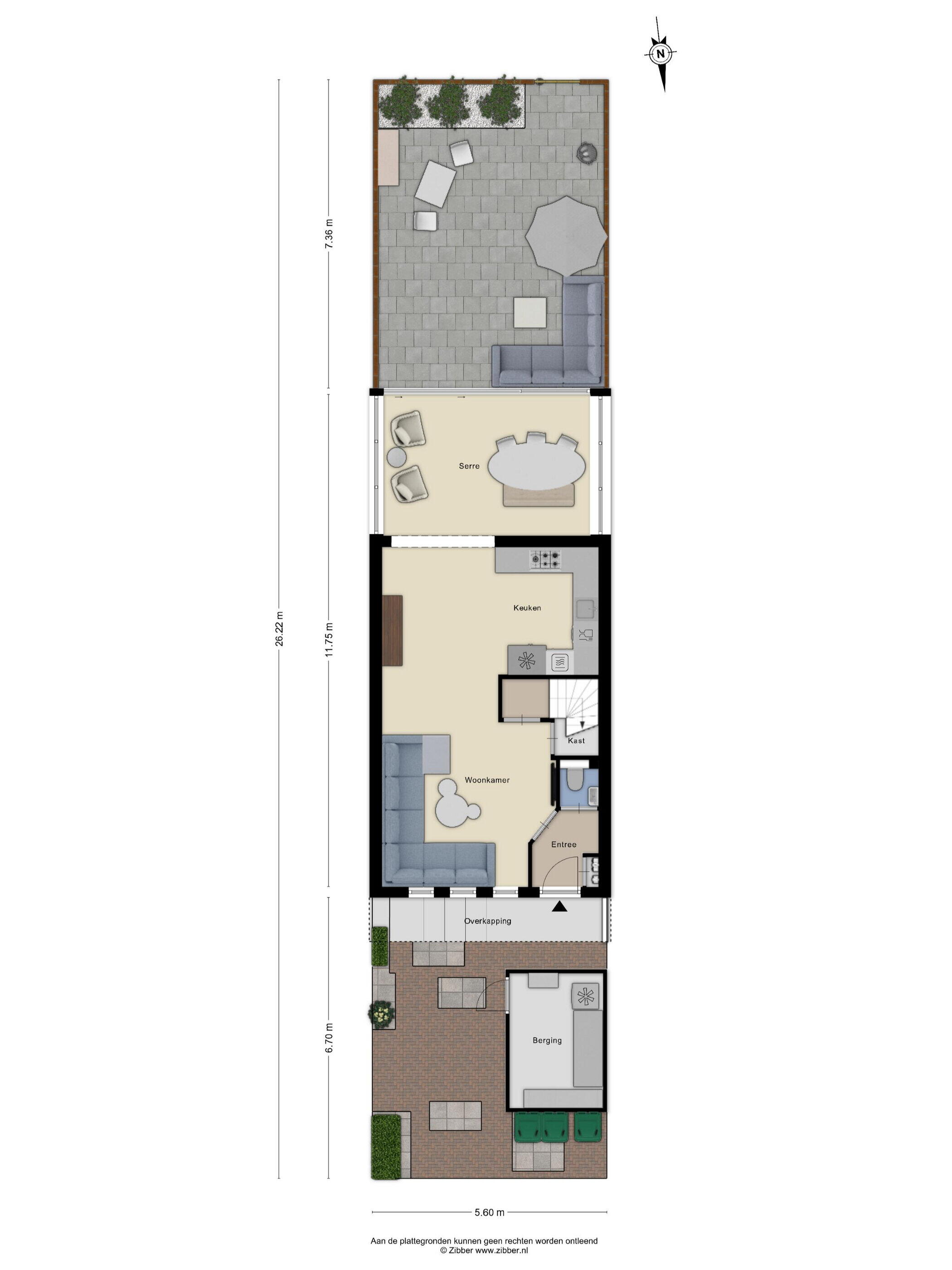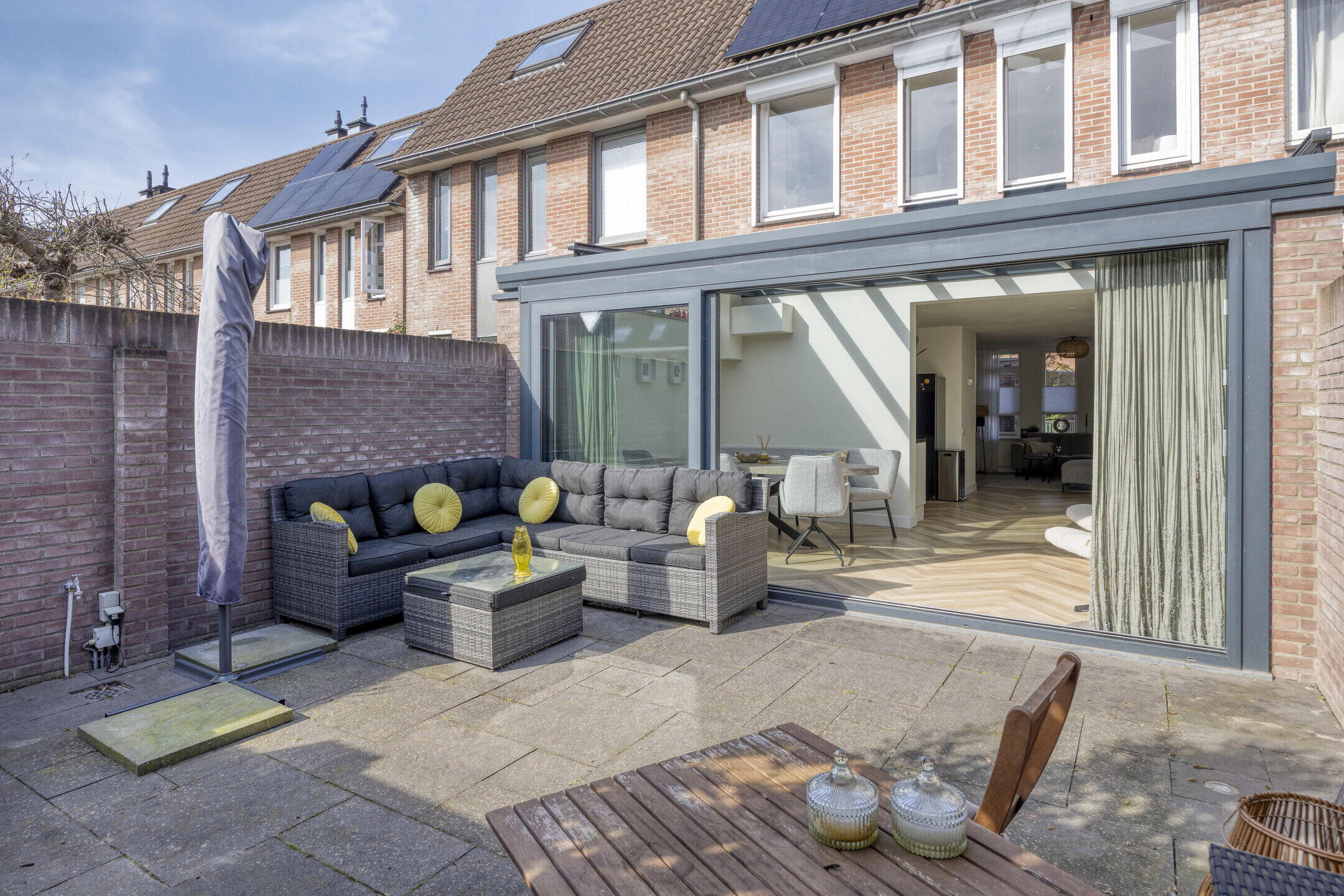 De achtertuin is netjes aangelegd en volledig betegeld, waardoor deze onderhoudsvriendelijk is. Via de schuifpui stap je zo naar buiten. Achterin zorgen drie boompjes voor een groene touch. Er is voldoende ruimte voor zowel een loungehoek als een eettafel. Daarnaast is er een handige achterom aanwezig.