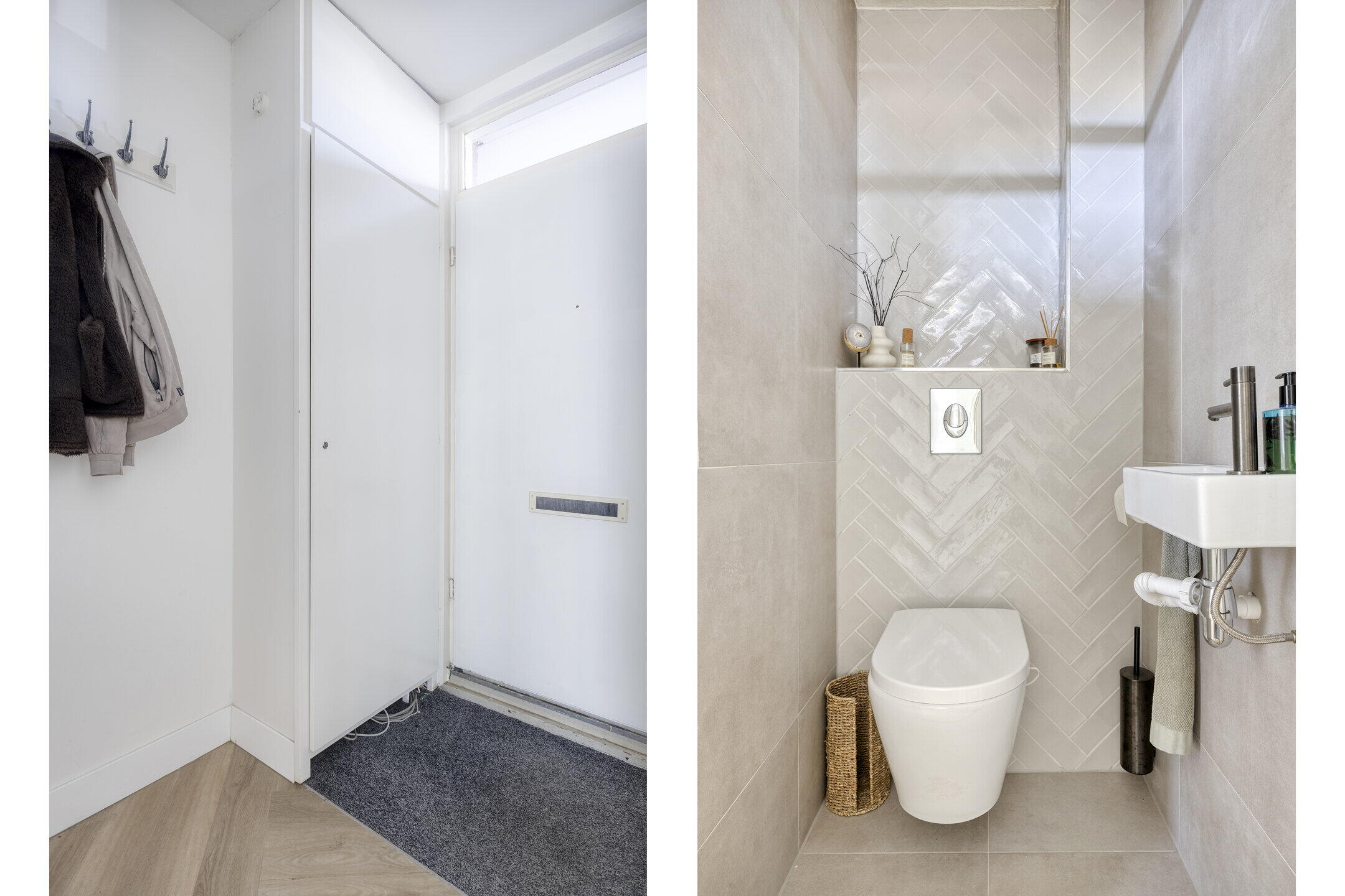 Via de onderhoudsvriendelijke voortuin, met een praktische stenen berging voor bijvoorbeeld fietsen of extra opslag, bereik je de woning. Binnenkomst in de hal geeft direct een verzorgde en moderne indruk. Hier vind je het stijlvolle toilet, uitgevoerd met beige tegels en een speelse visgraat gelegde metro tegel achterwand. De fraaie visgraatvloer die over de gehele begane grond ligt, zorgt meteen voor een warme en luxe uitstraling.